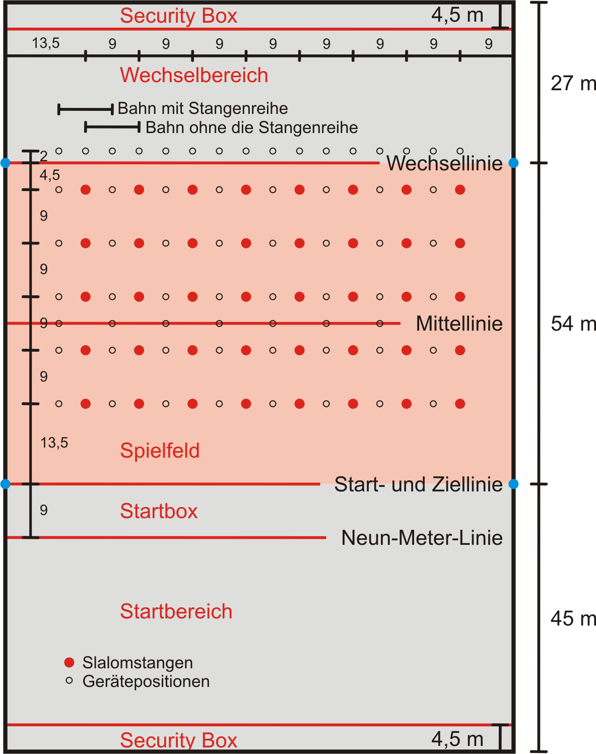 Das Spielfeld entspricht der internationalen Spielfeldgröße (9 m zwischen den Bahnen und rechte Außenbahn (vom Start aus gesehen), linke Außenbahn 13,5 m, Länge 126 m) siehe Abbildung: