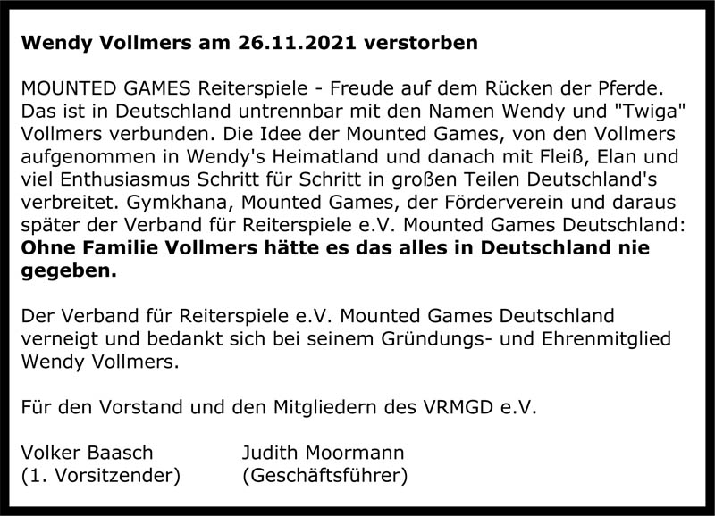 VRMGD trauert um Wendy Vollmers